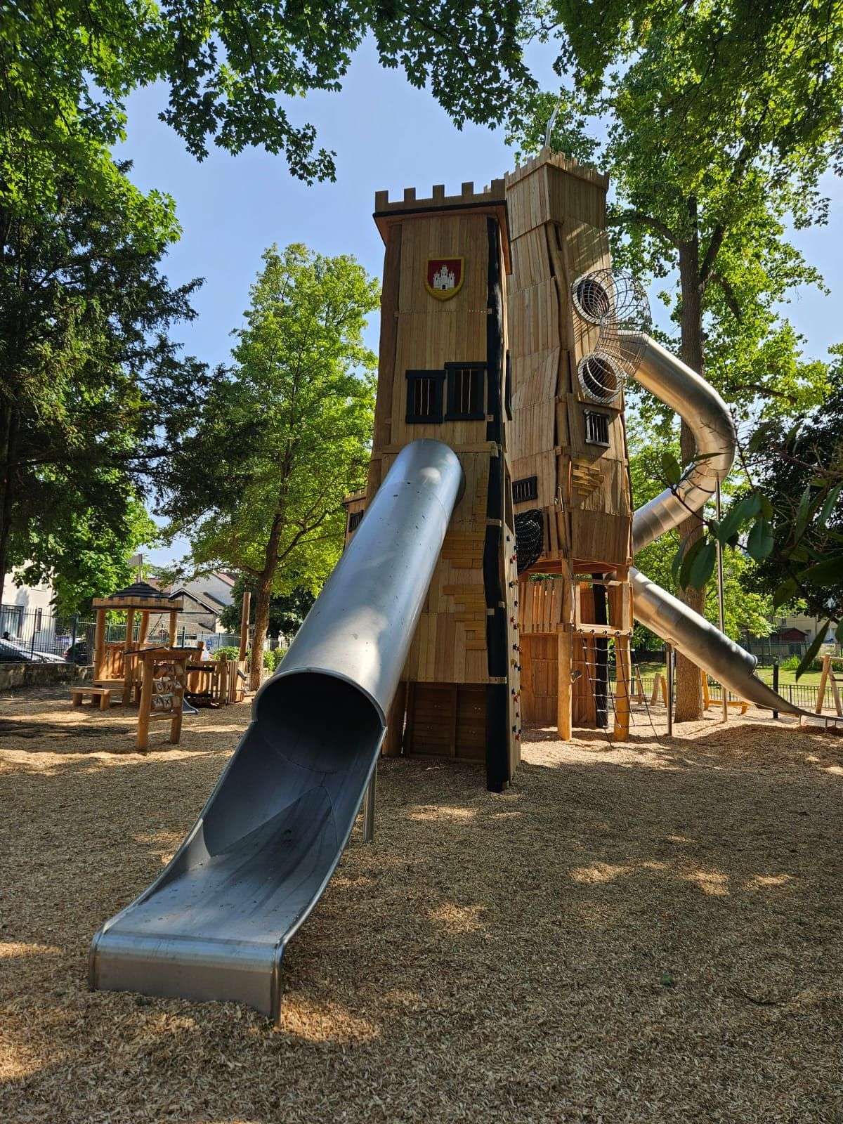L’aire de jeux château offre bien plus qu’un espace de jeu : c’est une immersion dans l’imaginaire médiéval. Tour de guet, pont-levis, remparts, toboggans ou cachettes secrètes : chaque élément stimule la créativité, favorise le jeu en groupe et encourage l’activité physique.