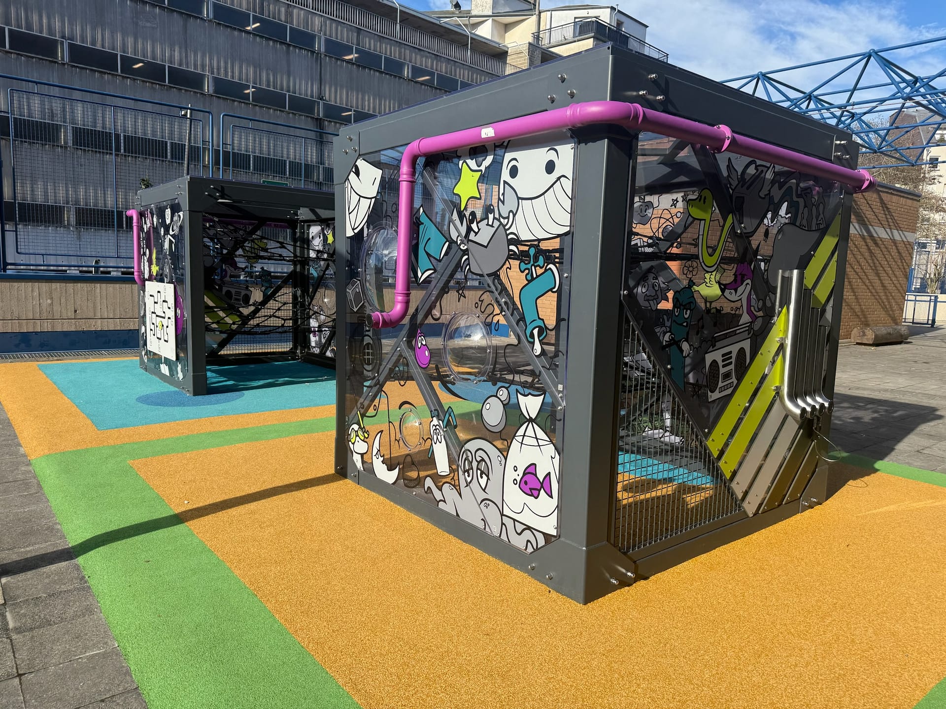 Structure Cubix en acier à 4 étages avec toboggans tubulaires